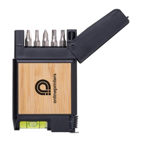 - Kunststof rolmaat van 3 meter met waterpas, vergrendelknop en vijf verschillende bits