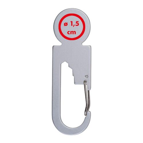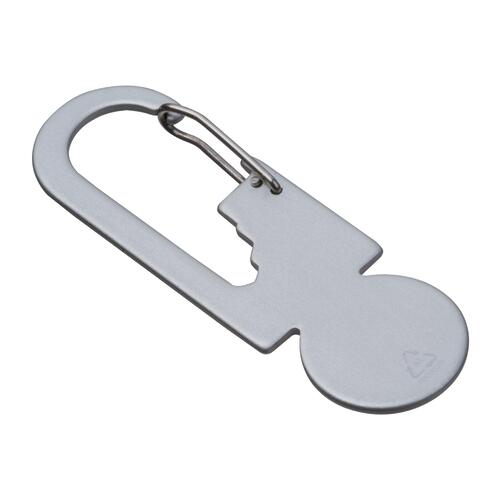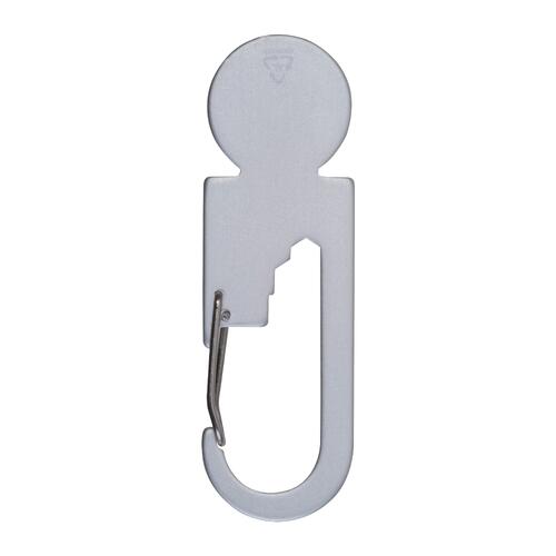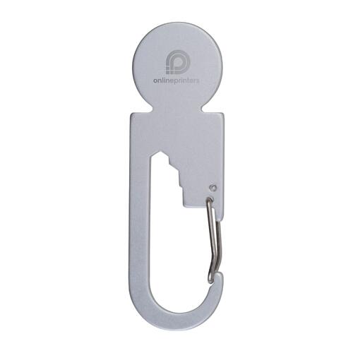• Multitool van gerecycled aluminium met winkelwagenontgrendelaar, drie zeskantsleutels in verschillende maten en een karabijnhaak