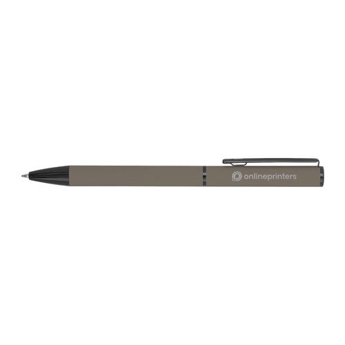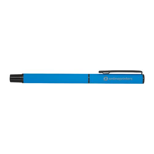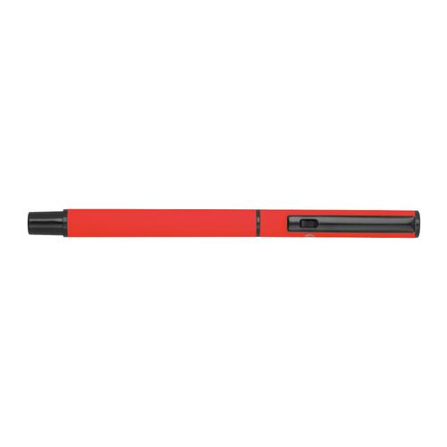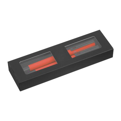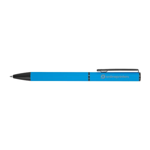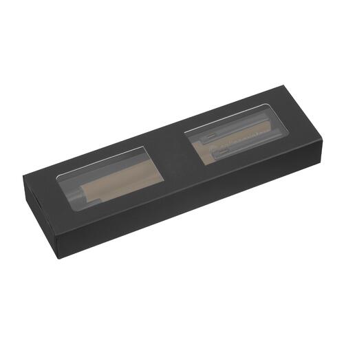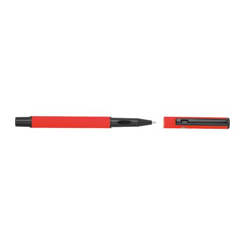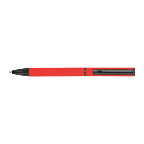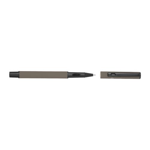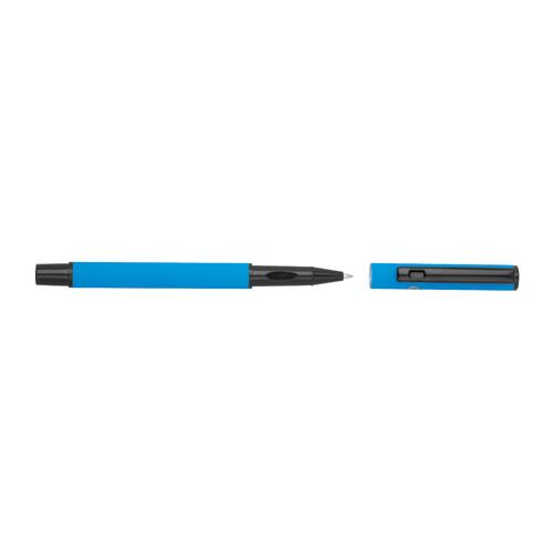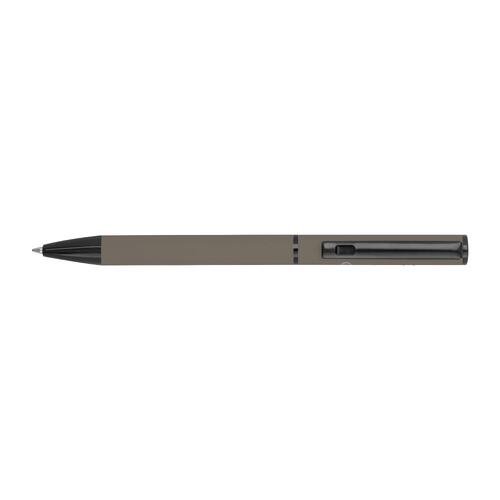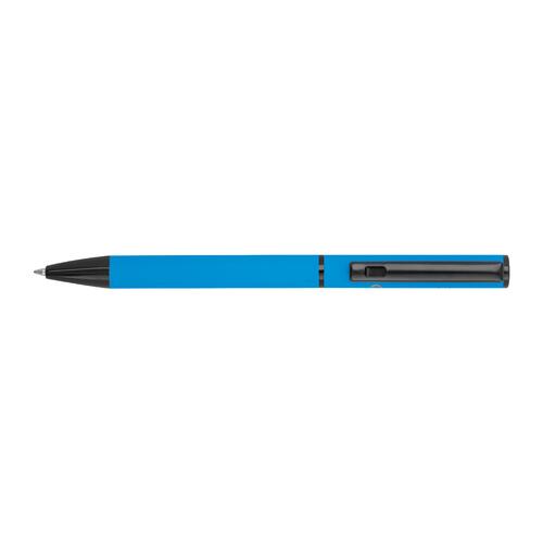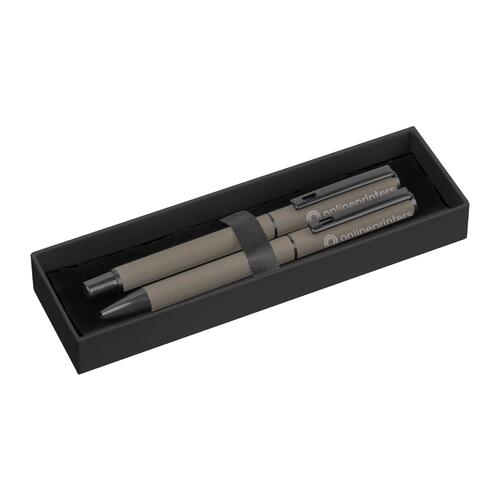 • Schrijfset van aluminium bestaande uit een rollerpen met zwarte inkt en een draaisysteem-balpen met blauwe inkt (kunststof vulling met groot volume), geleverd in een doos
